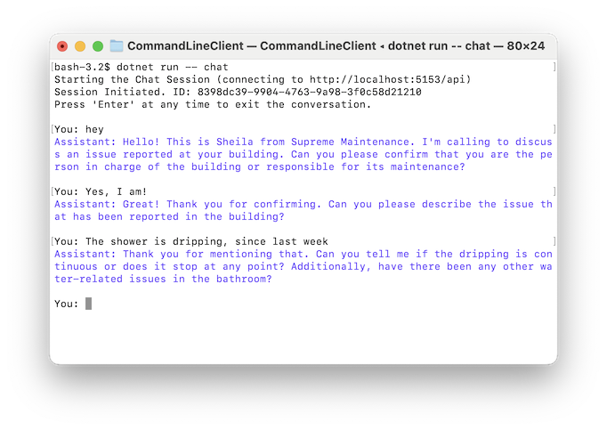 Command Line Client is a reference implementation of the chat client logic. Also it serves the purpose of being a useful tool in developing and fine tunning as assiatnt behaviour. when you run the executable in terminal, by default you will get the 'help' documentation.
